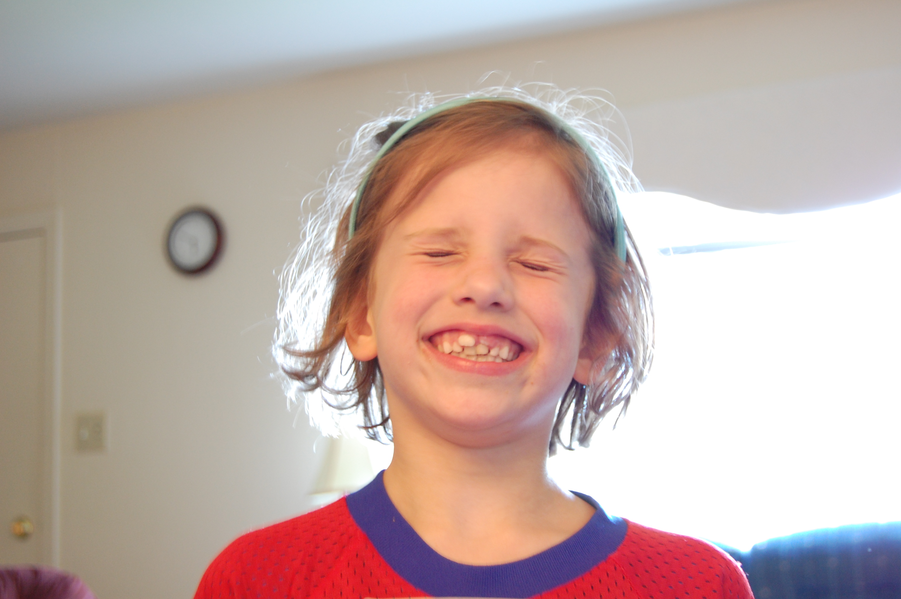 Sarah refuses to let us pull, touch, or talk about her two front teeth that are loose. I’m not saying that she’s in the wrong in being wary. I’m just saying: Look at the situation her teeth are in! She has two new teeth coming in over the top of the old ones. There is a running bet going that she will swallow one or more of her baby teeth in her sleep. Any other takers?
