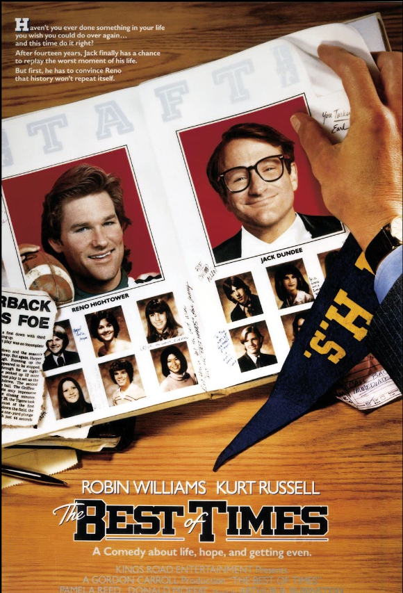 After quick search #1 of the movies credited to Cage on IMDB.com I discovered that he had first appeared in a movie I’d never heard of before called, The Best of Times. Quick search #2 told me that The Best of Times, released in 1986, starred the power-duo of Robin Williams and Kurt Russell, and quick search #3 told me I could stream this likely-not-a-gem on the Roku channel for free (albeit with those super annoying ads).