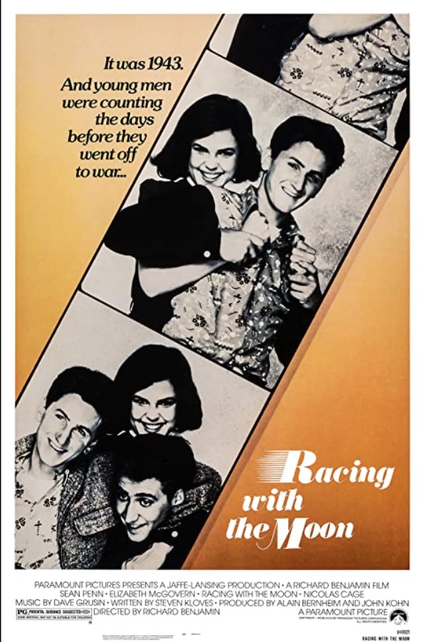In Racing With The Moon, Sean Penn and Nicolas Cage take on all the risks of young manhood as fast friends Henry “Hopper” Nash (Penn) and Nicky (Cage) who hop on trains, woo young women, and begin to face their own mortality as the prepare to enter the fray of World War II. The film, which takes place in the weeks leading up to their departure for the war, is titled Racing With the Moon because it describes Hop and Nicky’s moonlight practice of chasing down and riding passing trains along the coastline of their home-town in Point Muir, California (circa 1942.) While, at times, moving at a slower speed than passing trains, this film really does deliver some great acting moments from both actors which we will unpack here.