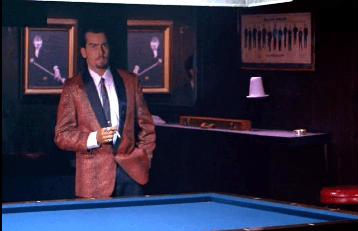 Then we have Charlie Sheen playing the pool shark, Morgan Gripp aka “Fats” in a brief scene where he takes Joey for $24,000 in a game of French (or carom) billiards. Of note, his Mephistophelean haircut, smoking jacket, and black three fingered glove outshines the dialogue.