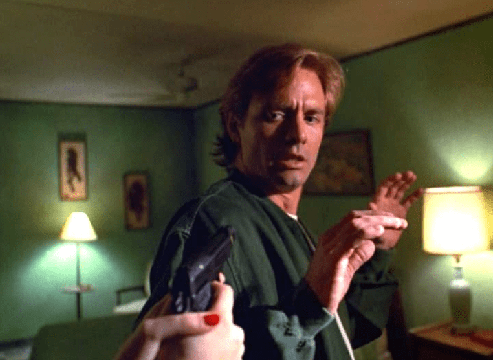 Imagine if you will: Michael Biehn from The Terminator (with his six pack abs) playing an over-narrating con man, Joey, who is working with his con man father, Mike (played by James Colburn) to fleece a mark out of a case full of cash.The deal goes sour when the (in-on-it) cops show up to spook the mark into leaving his money behind during a firefight in which Joey stage-shoots Mike (who is pretending to be the goods dealer). When the mark flees, the con men (Joey, and the fake police) laugh and celebrate their success only to realize that Mike is not stirring from his prostrate position. He’s been actually shot–with real bullets, instead of of the planned-for blanks. Shot by his bewildered son!
