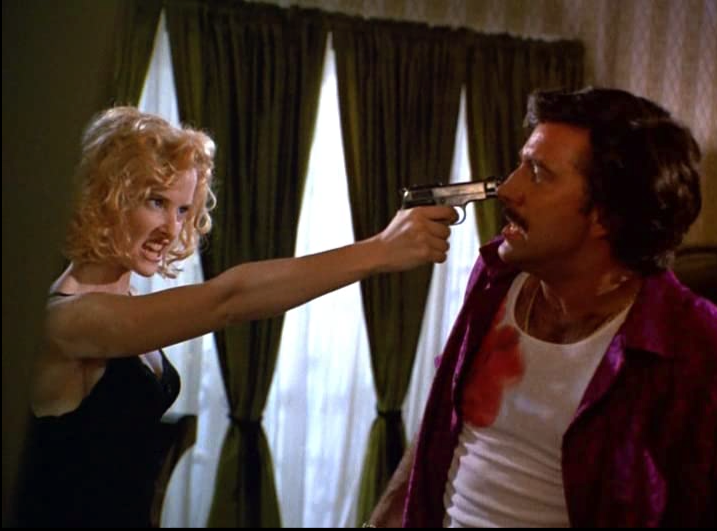“Ok, baby girl. Who sent ya? Who sent ya?” Eddie to his assassin. Assassin’s reply: “Sam FUCKIN’ Peckinpah!” which is parroting back of what Eddie had said earlier in the strip club.