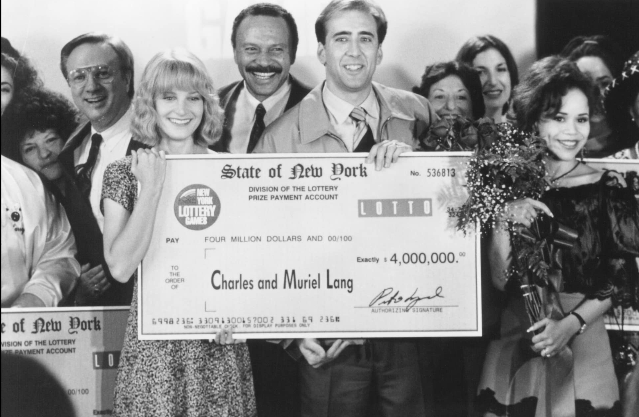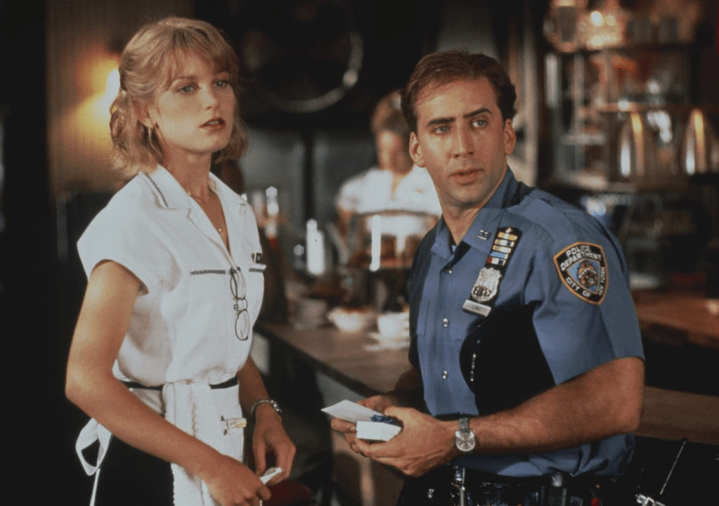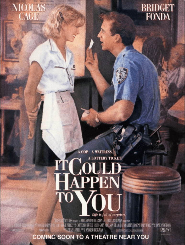 In this movie we get to see the softer side of Mr. Crazy Cage as Officer Charlie Lang, a New York City beat cop who is in an unhappy marriage to a fortune-and-fame obsessed hair stylist, Muriel (played by Rosie Perez) but who’s life takes an unexpected turn when his numbers win him the state lottery to the tune of $4 million dollars.