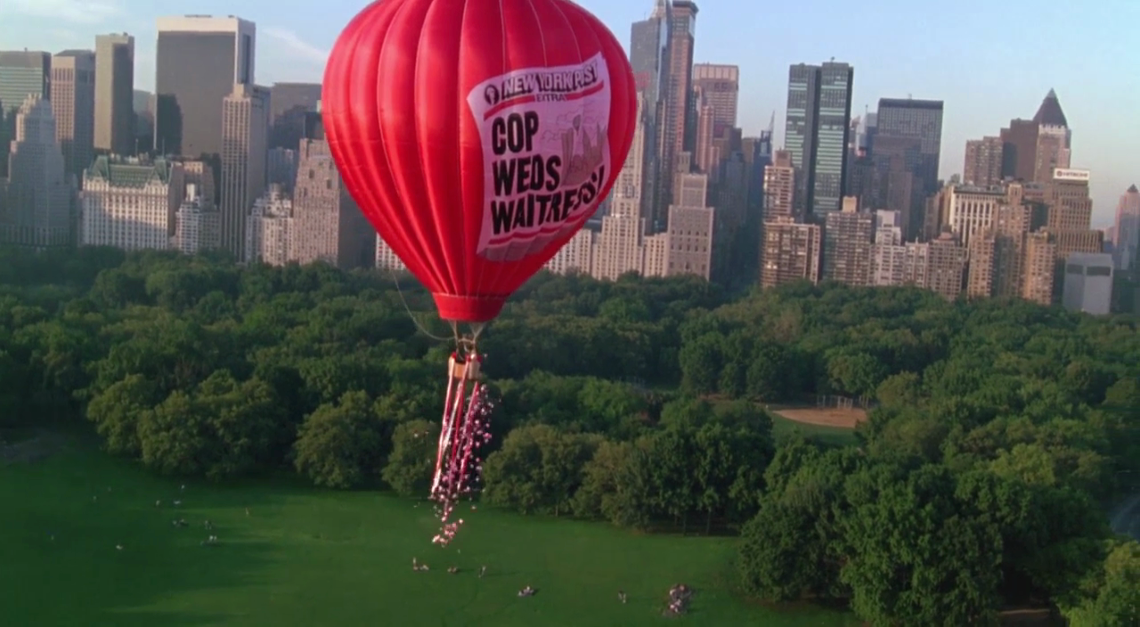 The last scene of the movie shows the two happy not-quite millionaires setting sail on a giant hot air balloon with a New York Post headline emblazoned across it’s inflated side that says COP WEDS WAITRESS. As they ascend to the heavens of their love and coming life together, the two pour all the colorful letters (that took them three days to open) over the side onto the city that has bequeathed them. (We’ll forgive the littering. It was 1994.)