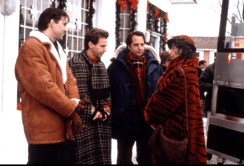 Trapped in Paradise is the story of three Italian (?) brothers: the Firpos. Bill Firpo (played by Cage) is the dutiful and hard-working son who supports his widowed mother as a restaurant manager, while trying to keep his paroled goofball brothers, Alvin (Carvey) and Dave (Lovitz) from returning to jail. Alvin, who throughout the movie talks a bit like a Ren & Stimpy character, is an imbecilic kleptomaniac who stuffs everything he sees (including Pez dispensers, handfuls of Cap N’ Crunch cereal, ski masks) into his deep pockets wherever he goes. Dave seems to be playing the low-fi con man, a reprisal less funny version of his pathological liar from SNL, Tommy Flanigan. Bill plays the exasperated straight man, one part Larry from the Three Stooges and one part a more mellow version of his Michael character from Red Rock West.