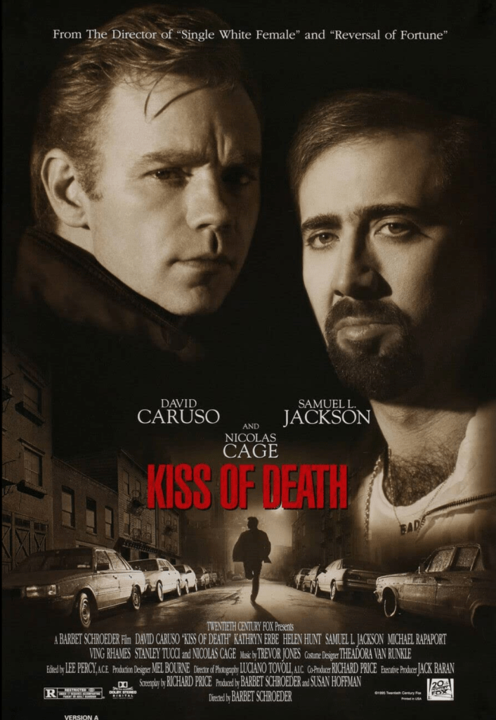 Kiss of Death (1995) which is one of at least 6 movies with this same title, tells the story of Jimmy (played by David Caruso) an ex-con who is recently out of prison and looking for a clean start with his wife (played by Helen Hunt) and young daughter. Struggling to make ends meet, Jimmy reluctantly agrees to help his cousin Ronny (played by Michael Rappaport) do one quick job, driving a truck for a few hours to earn a few grand and stay in the good graces of Little Junior Brown. Surprising no one at all, a police sting intercepts the fleet of stolen vehicles putting Jimmy’s future at risk.