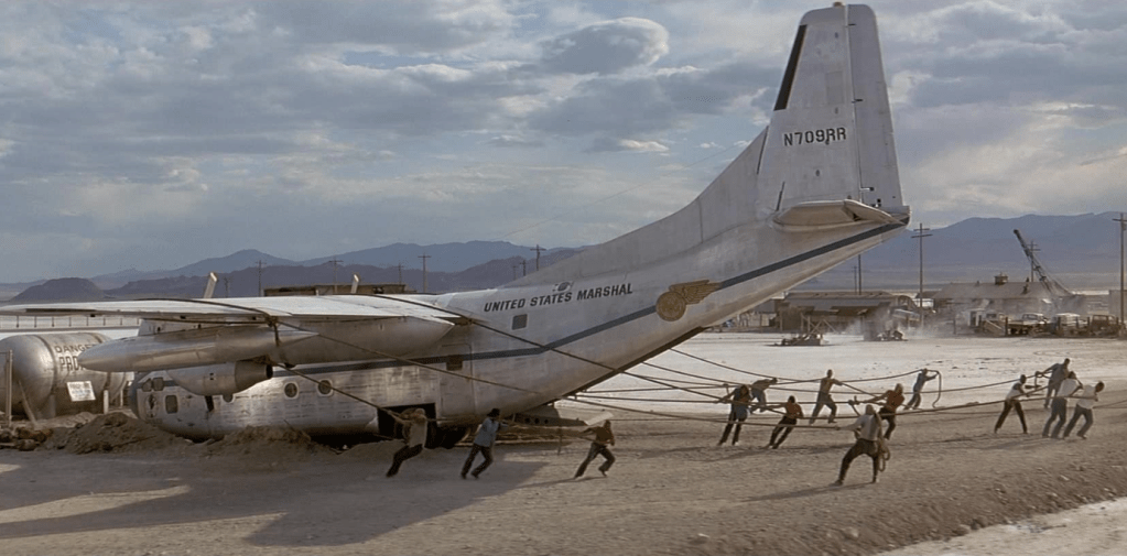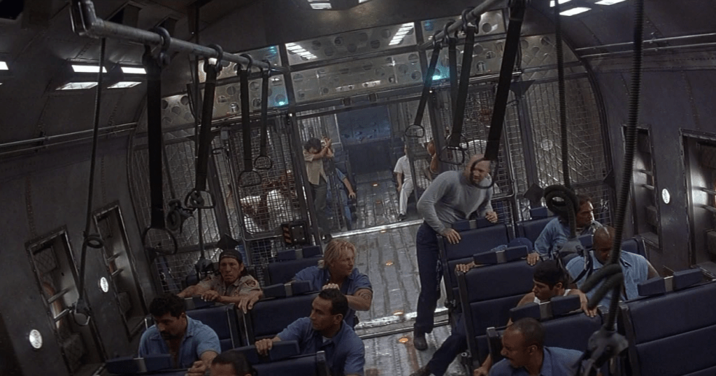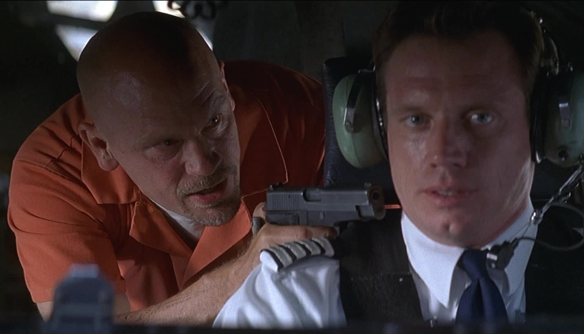 Based on the summary of the characters above, I’m betting you can fill in most of the blanks. Even though the prisoners are secured at departure (via handcuffs or cages) they quickly turn the tables on the police officers, free themselves, gain weapons, and leverage for a tidy escape. All without the U.S. marshals on the ground discovering that the plane is no longer under police control.