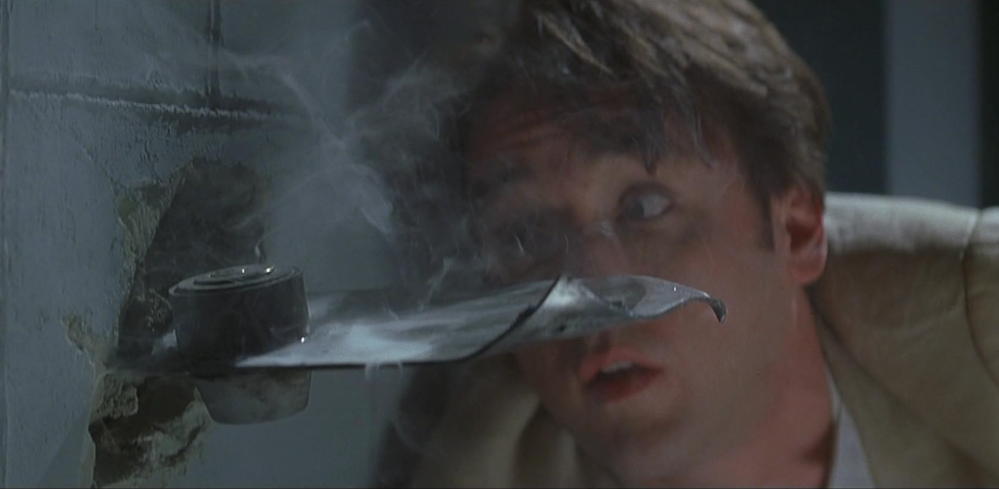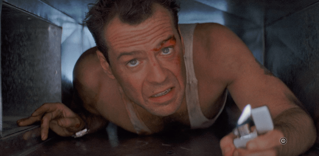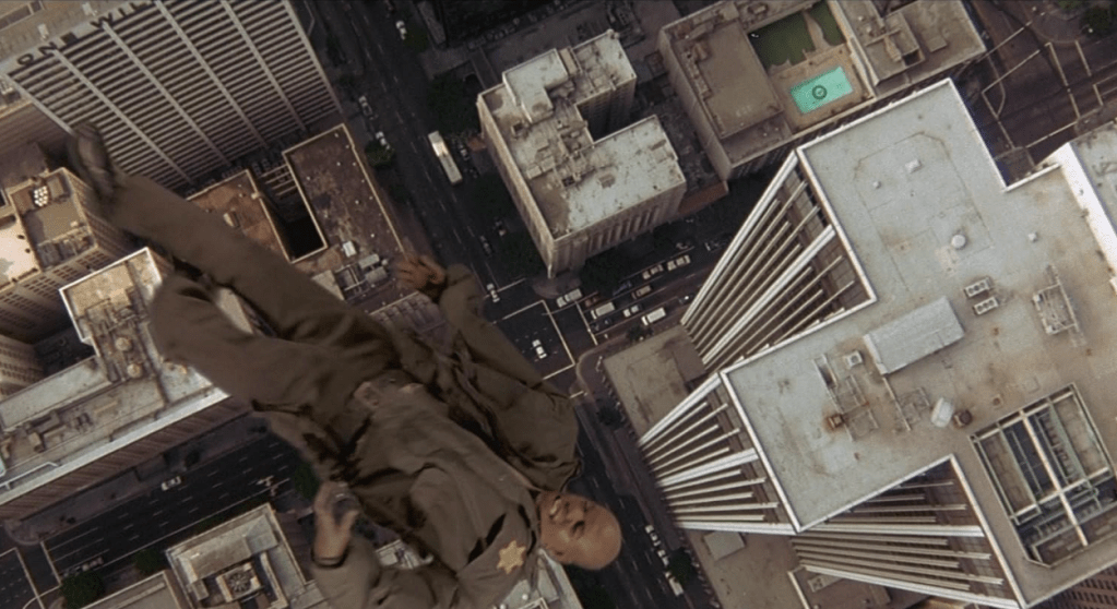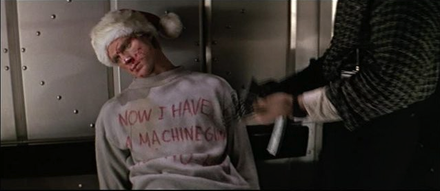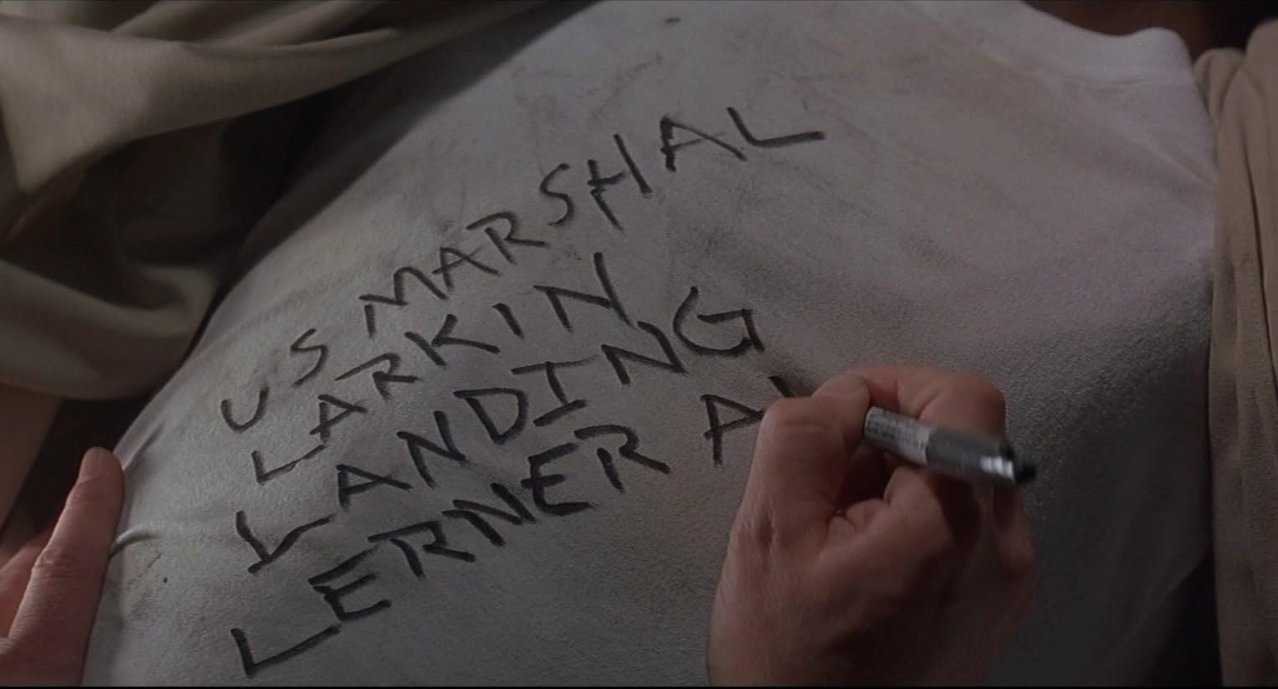 McClaine sends messages written on the bodies of the terrorist he is forced to kill (Now I have a machine gun, ho-ho-ho), Poe sends a message (US Marshal Larkin Landing Learner Airfield as clue to the plane’s destination) to Larkin which he pens onto the body of Pinball Parker before he drops his corpse from the plane onto a busy city street.