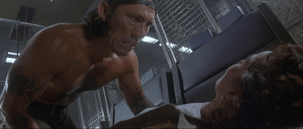 In some ways Con Air plays out like a reverse Dirty Dozen or Seven Samurai. Instead of bringing together a team of unique and specialized individuals to use their combined skills in a defensive plan to hold serve with an aggressive invading (and evil) force, Con Air does the opposite. As Poe sets his sights on a return home, the deck gets stacked in the villains favor with more and more dangerous and volatile characters with their own twisted “specialities” from patricides, to serial killers, rapists, arsonists, and con men–each traveler on Con Air has a pretty long rap sheet of dangerously bad behavior, all of which endanger the plan to the secure return home that Poe envisions for himself. The lone good guy, Cameron Poe, is the first and last line of defense tasked with the responsibility of preventing this plane-full of outlaws from escaping their cell and wreaking havoc on any innocent people within their orbit.