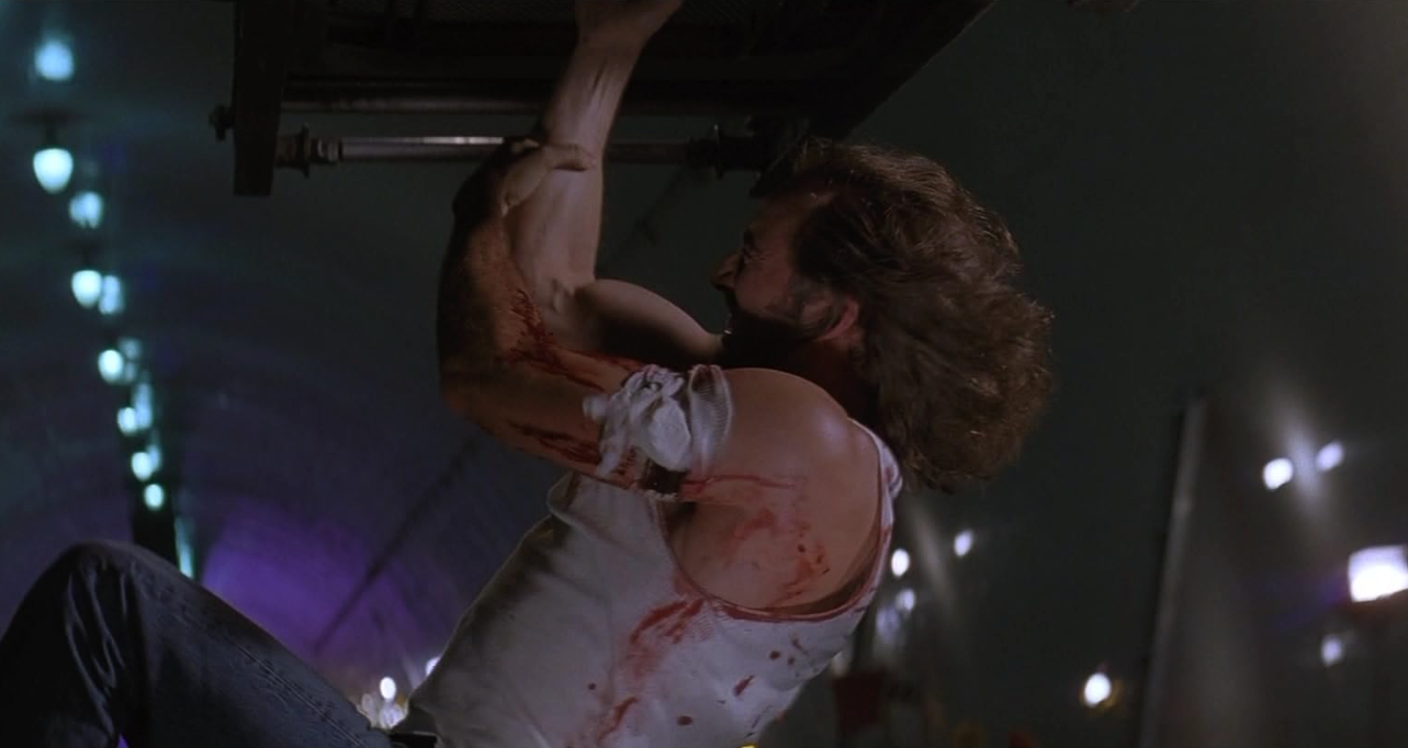 For example, when you think about it, Con Air (like Fire Birds ripping off Top Gun) is an airborne riff on Die Hard, but it’s done in a way that somehow seems even more LOL-ridiculous (and engaging) than a group of German terrorists taking on Bruce Willis in their attempt to rob L.A.’s Nakatomi Plaza tower on Christmas Eve. With John McClaine (Willis), we have a New York policeman trying to make amends with his estranged L.A. wife. He gets caught up (wrong place/wrong time) in a terrorist take-over of the building she is working in.