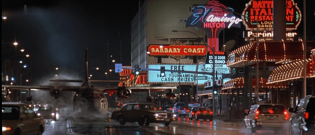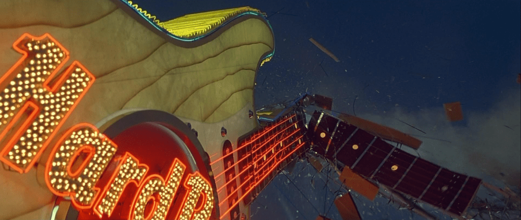 If you like big movie endings, you’ll love Con Air‘s final moments. After the Jailbird crashes onto the Vegas strip, clipping the neck of the Hard Rock Cafe guitar, Larkin and Poe must hop on motorcycles to chase down Swamp Thing and Cyrus who have escaped the crash in a stolen fire engine.