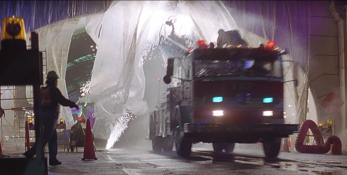 As Swamp Thing accelerates down the busy Vegas Strip colliding with various objects and low-hanging overpasses, Cyrus attempts to use the engine’s ladder, a long hook, and the firehose itself to expell Poe and Larkin from further pursuit. In the end after some hand to hand combat, Poe is able to jump from the fire engine as it somehow collides with and scatters a giant pile (bag?) of cash all over the street.
