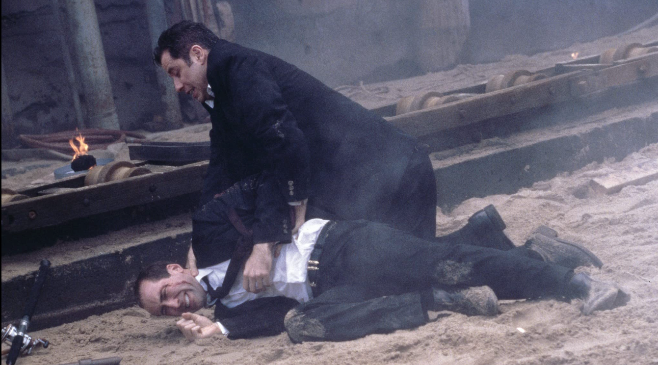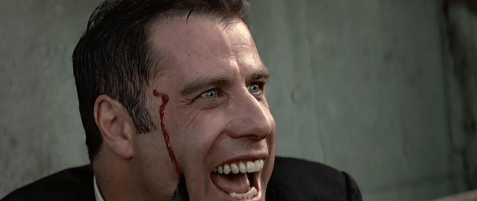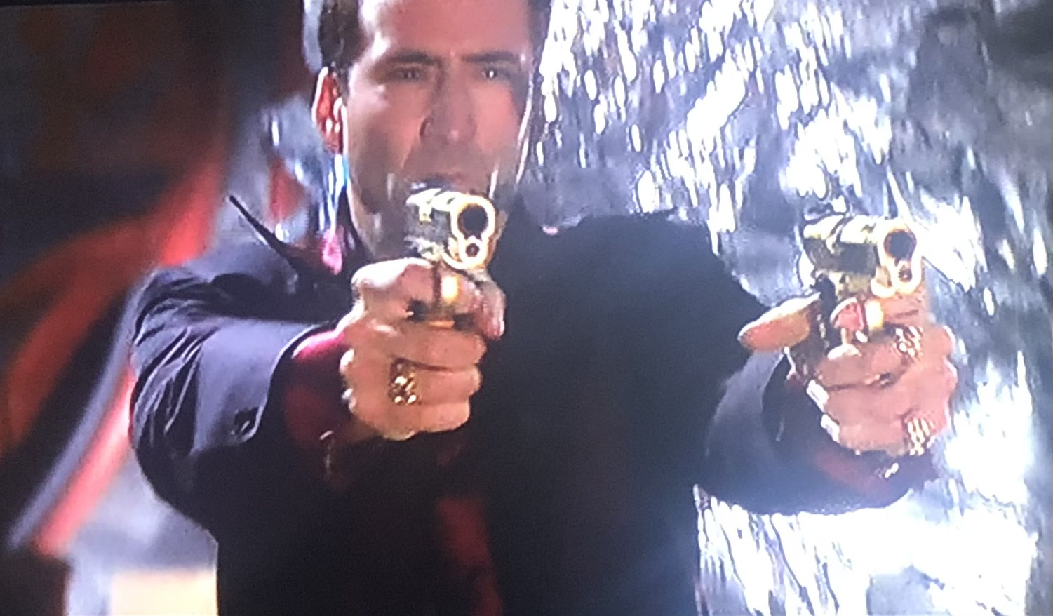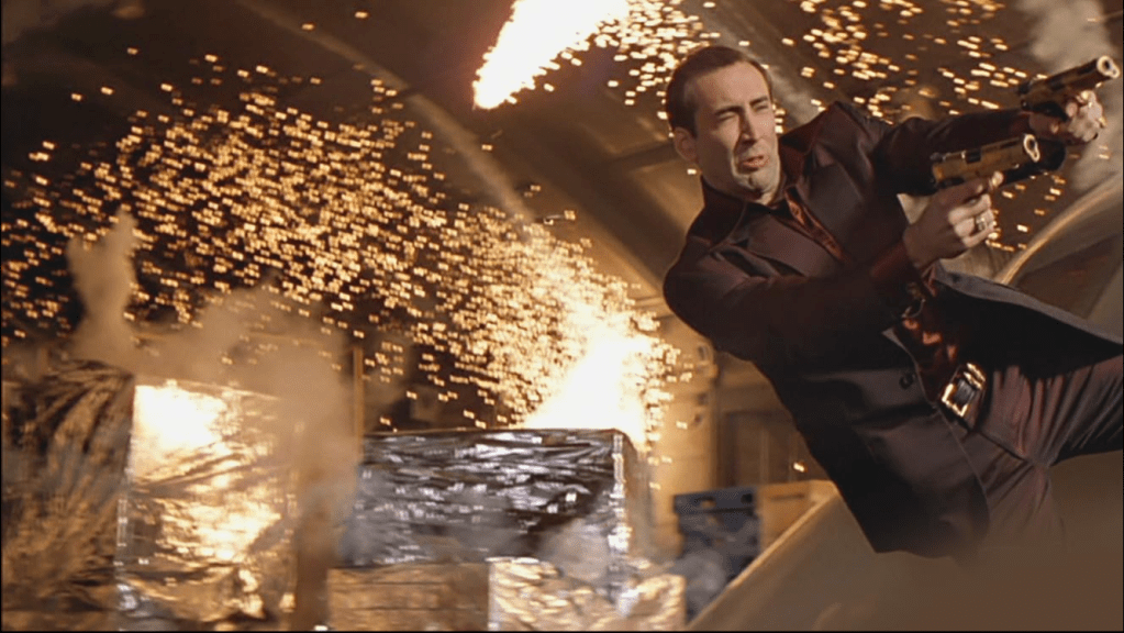 Before we summarize what happens plot- and acting-wise in this movie, I have to give credit to John Woo for his contribution and influence on American action movies. While I am no movie historian, and don’t know if he was the first or most famous to use this technique, it was John Woo who employed and mastered “the guy jumping horizontally while shooting two handguns at the same time” action sequences. (There’s also gotta be a more elegant shorthand name for that.) In Face/Off we’re given many opportunities to see this with Cage and Travolta and others.