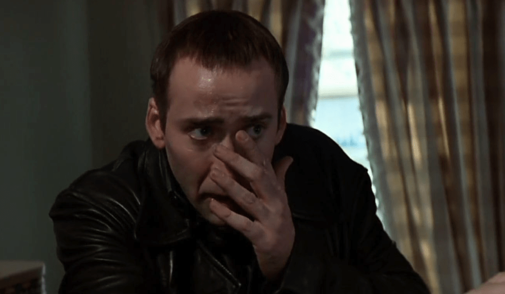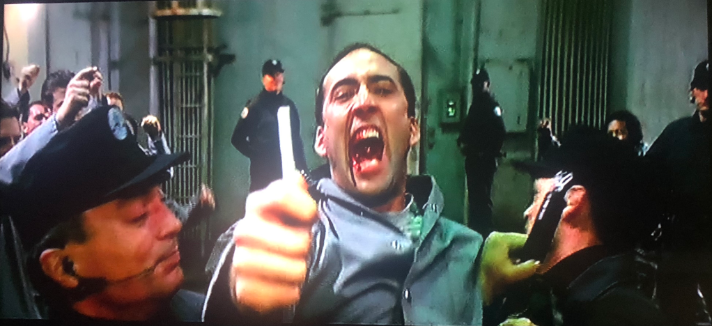 - The Cage insanity-bugged-out-eyes in Face/Off are unparalleled. These images have to be the most memed of any Nicolas Cage movies. The priest scene, the jail fight scene, and the post-drug bathroom scene are the ‘pictures that say a thousand words’ on behalf of Sir Nicolas Cage. The internet got built with these images.