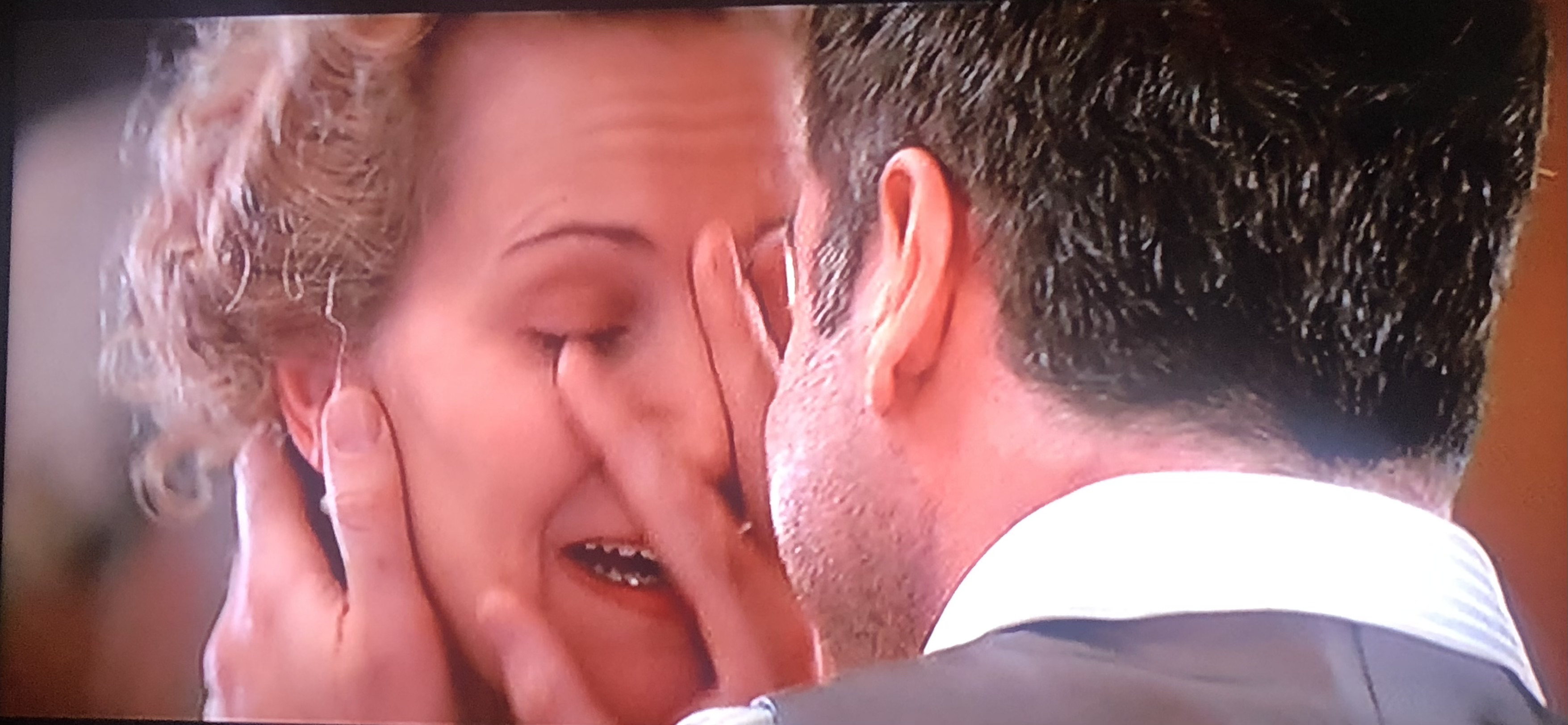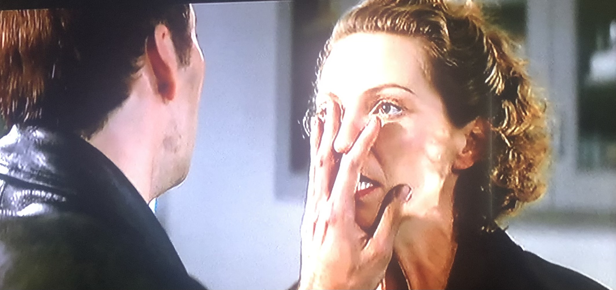 - The love touch*. Rewatching this movie, the weirdest and most outlandish part is the unique way that Sean Archer shows physical affection to his family. Woo called it the love touch. I don’t know how things work in Hong Kong or if this is some kind of cross-cultural behavior that just doesn’t make sense in the U.S. but the love touch is not something I’ve seen much in my life. Basically, the photos below will tell you all you need to know. From the first scene to the last, Sean and his family do this thing where they drag their hand lightly down the face of their loved ones. It could easily be interpreted differently (in the pictures) as one person shoving another person’s face or covering it so you don’t have to see it. But that wasn’t the intent. It’s supposed to be some very bizarre show of affection. What made this even worse was the knowledge that this gesture was going to be an undeniable clue that Sean was the one behind Castor’s face (e.g. “Only Sean shows me he cares with the love touch!”) I guess honking the nose, touching the brow, caressing the forehead, or calling his loved ones “pumpkin” was way too subtle. So we end up with so, so many people experiencing Woo’s love touch. And it’s quite (unintentionally) hilarious.