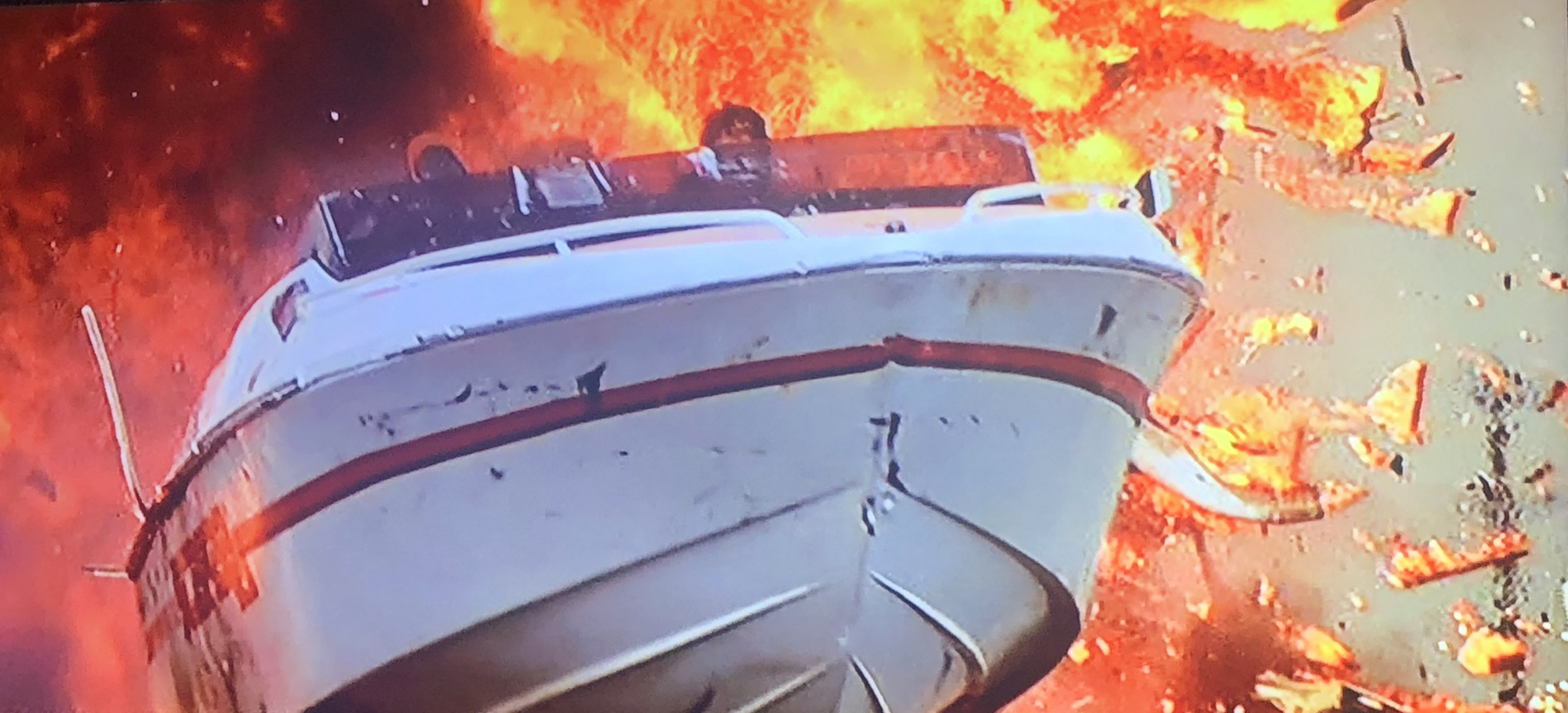 After an intense shootout at a beachside cathedral, Archer chases Troy (in coordinated red and white speedboats) on a bonkers aquatic path that leaves fiery destruction, dead Coast guard officers, and a peaceful boating day entirely obliterated in its sloppy wake. Both men end up stranded and gunless on the beach, fighting with metal pipes, sand, and a harpoon gun, until one harpoon ends up in the guts of fake Sean (who has just tried to cut his own face off with a sharp piece of glass).