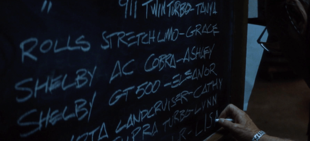 A lot of work goes into the preparation–finding and forming and convincing the team–and then casing the cars which are all code-named after women, and written on a big chalk board, for easy visual access and (duh) ironically police observation.