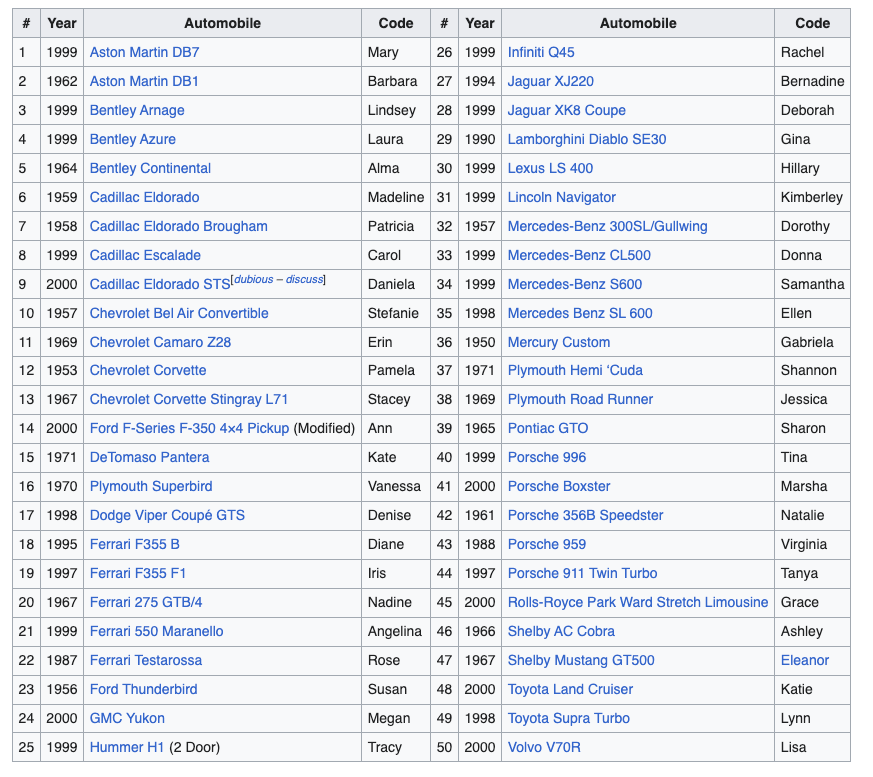 - I was trying to write down the list of cars with all the female alias, but of course someone has already done this work for me. You can see the list here or on wikipedia where I found it. None of the women in my household were named in this theft: Christa, Colette (or Sarah), Anna.