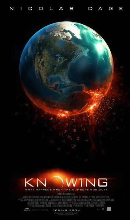 I thought about those decades-gone school days, and the-end-of-all-things while watching Nicolas Cage’s entertaining apocalyptic thriller Knowing (2009). Coming in at #52, Knowing inches us ever closer to the summit of our WATC(H) mountain of movies, in the sense that it’s nearly halfway to the finish line–there and back again as Tolkien liked to describe the journey.