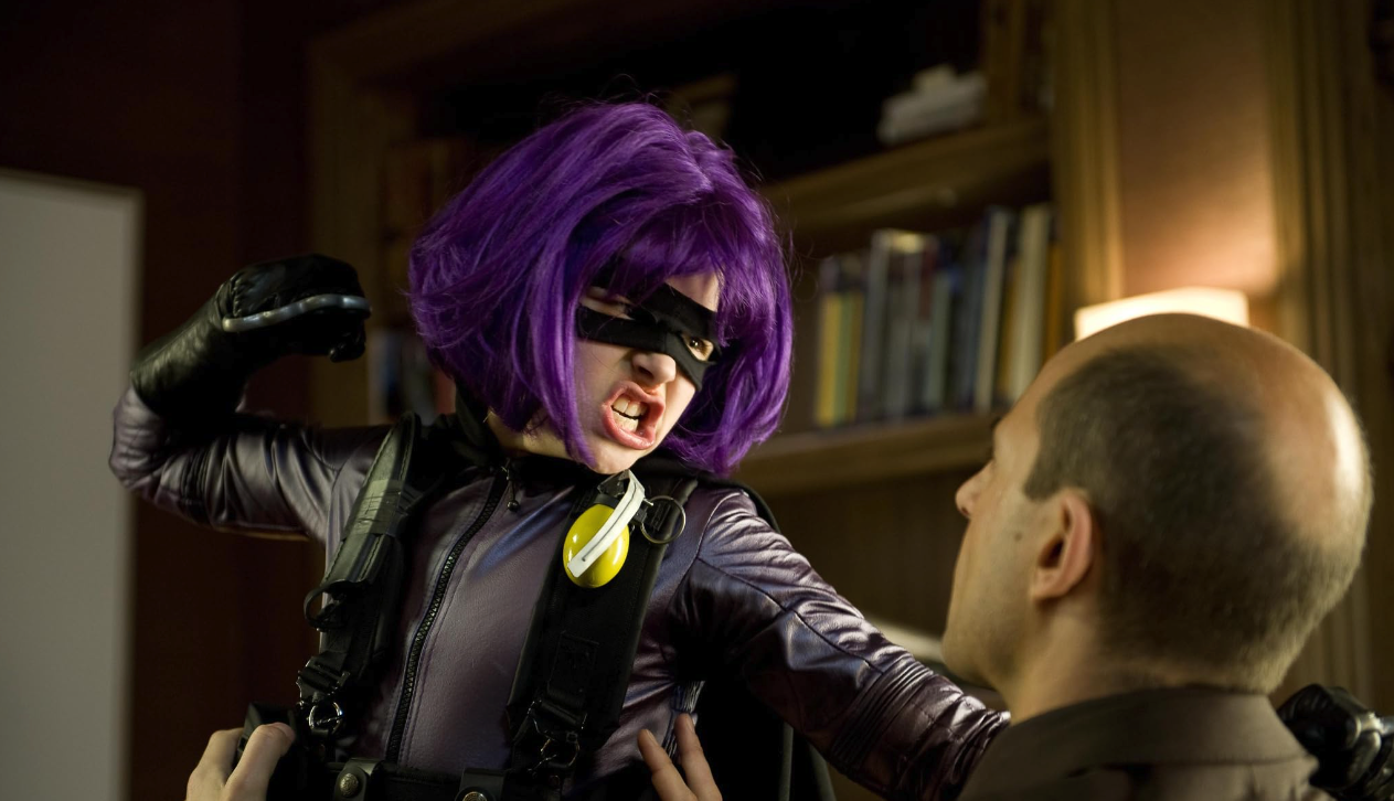 Big Daddy is not the upright do-gooding dispenser of justice, but instead is a no-holds-barred vigilante bent on taking vengeance against the man who framed him and sent him to prison (causing him to lose his wife, police job, and standing in the community). Damon Macready / Big Daddy is a militarily savvy strategist and weapons expert who has framed his entire life around finding and dismantling the empire of crime kingpin Frank D’Amico (Mark Strong). Big Daddy’s greatest weapon and most precious gift is embodied in his young foul-mouthed and worldly-wise daughter Mindy, whom he has raised up in the art of hardcore vigilantism, i.e. Hit Girl. Even though she’s only 11, she’s not afraid to drop the c-word while stabbing a guy in the throat. She’s already a proven killer and well-equipped to take on any and all hand-to-hand and weapons combat needed to take out various street thugs, Mafiosos, and hired killers. Her disdain for Kick-Ass’s obvious lack of training and inept attempts at vigilante life, drives the comedy and somehow makes her an even cuter “kid”.