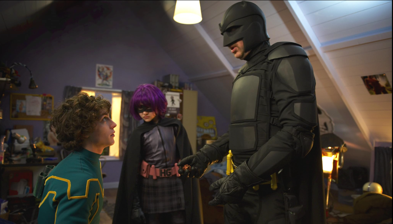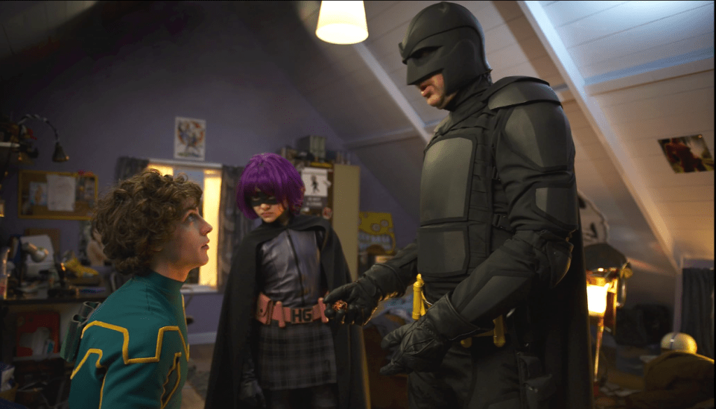 From the bullet-blocking costumes with capes, to the hidden armory / hideout within their home, Big Daddy and Hit Girl are instantly recognizable as the edgier modern take on the octogenarian D.C. duo. But similar to Christian Bale’s Dark Knight and Amazon’s darkly satirical The Boys, these Kick-Ass characters are not the innocent gee-willikers hero tropes from the 1950s Batman and Robin. Not by far.