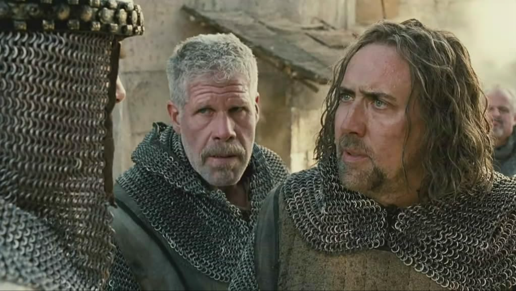 Season of the Witch is about two crusading knights fighting for God and Christianity during the mid-1300s. Behman (Nicolas Cage) is the softer spoken do-gooder, while Felson (Ron Perlman) is his slightly more cynical pal who enjoys betting on death counts prior to going into battle. (Whoever kills the least buys the beer and women) As the years of warring run into decades of murdering more and more “Infidels” whom they discover are mostly just like them, the two knights grow weary of their “holy call” of killing for Christ, especially after Behman accidentally runs a sword through a defenseless woman. The two decide to desert their calling and post, and head back to Europe.
