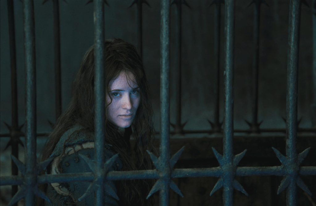But they get caught along the way. In order to escape a long sentence in a dank dungeon, the two reluctantly agree to a pardon pact where they work for their former employer (the Holy Church) by helping transport an “alleged” witch from the town they are in to another town some “400 leagues” away by horse. Supposedly so the witch can face a fair trial. Along the way, the two knights talk theology, curses, witchcraft, and life experience. They take on a protege, side-eye their morally questionable guide, and try to figure out whether the woman the have trapped in a wagon-cage is just a misunderstood victim of the church (like them) or a powerful and insidious purveyor of black magic. The Witch messes with their minds through basic psychology and the supernatural, and successfully kills off some of the traveling party with wolves and friendly fire, before they even arrive at their destination.