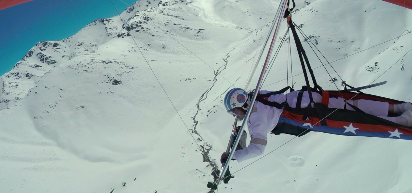 - Hang gliding in a U.S. flag designed glider and outfit while waving a samurai sword