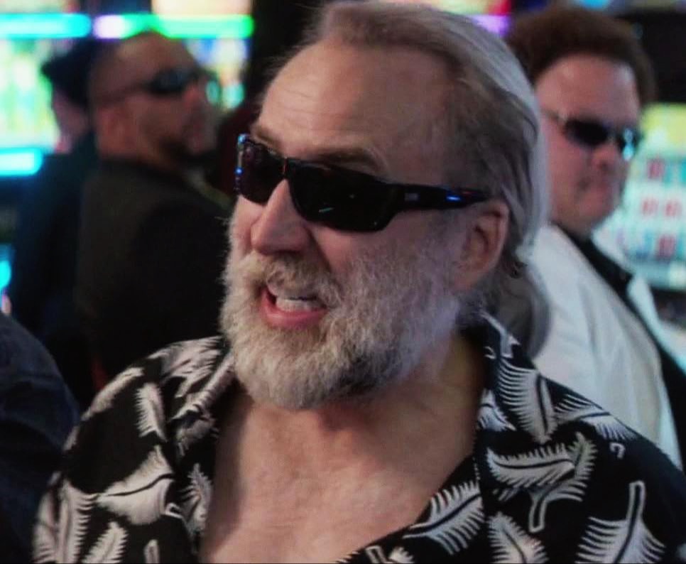 Gary has friends, and speaks to them a thousand miles a minute in a high-pitched Steve Urkel reminiscent twang that (to me) sounds like fingernails on a chalkboard. But to be clear, this effect is mostly a Cage embellishment of the actual person as far as I can tell (when compared to RL Gary Faulkner’s interviews that run during the credits). According to Cage, Gary is schlumpy (translation: fat and out of shape) has long gray hair and beard and is an extreme and “sad” character.