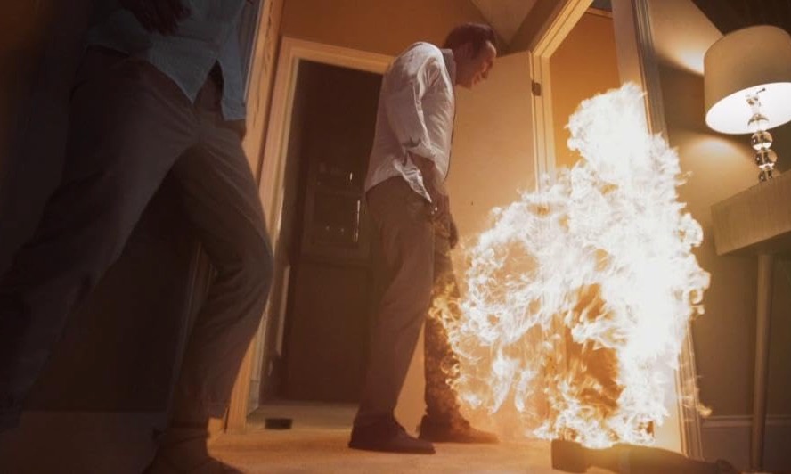 I can almost hear The Talking Heads Once In A Lifetime playing as soundtrack for this scene (even though the punk aesthetic of Reagan Youth’s Anytown and Brent’s Misfits T-shirt was a right, and savvy decision.) In some ways, this violent anger that seethes under the surface of Brent’s waking life is merely unleashed and embodied through the “terrorist” activation that has lead to these horrific events. The levee has finally broken, and we are just seeing Brent as his rawest, truest self–untethered from all moral constraints. Strangely, the act of trying to murder his children is a vengeful act for the perceived (but not real) injustices he has suffered for becoming a father. It’s much like Vengeance: A Love Story but without any real justification. Just blind rage.