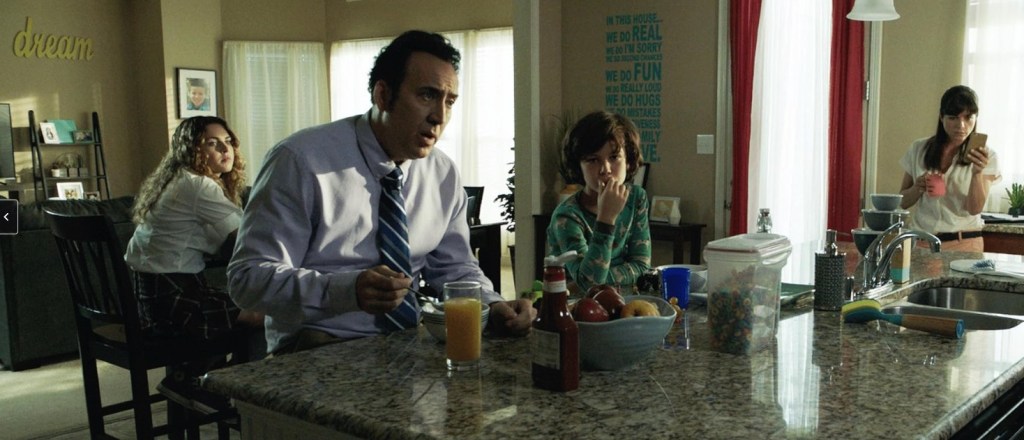 Brent (Nicolas Cage) is a 40-something WASP married to Kendall (Selma Blair) and the two live in a nice house in an unnamed American suburbia. Brent, a machine parts salesmen, is firmly upper middle class and protective of his rebellious high school daughter, Karly, and takes great pride in his pre-school aged son, Josh, who hangs out in his pajamas all day playing with toy trucks under the supervision of the Asian house cleaner / nanny, Sun-Yi (Sharon Gee). On the surface, everything fits the American dream narrative (2 car garage, a nice lawn, white collar job) but Brent (and Kendall) are both pretty miserable under the surface of their daily life and routines–feeling as if they’ve compromised themselves to become parents and providers.