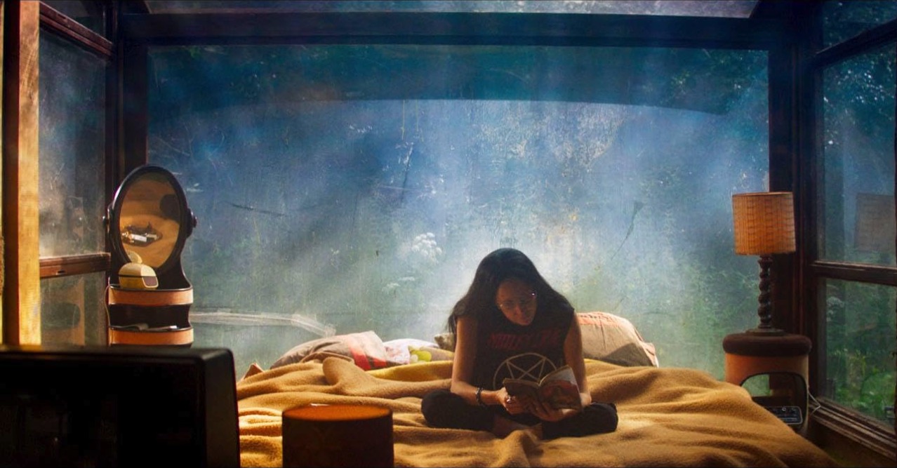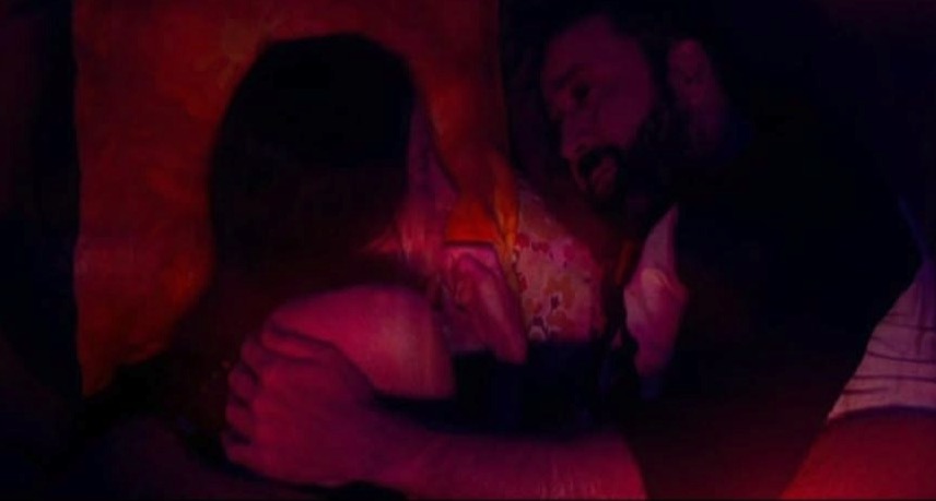 Red and Mandy seem to have a happy (if solitary) life together. They spend time smoking cigarettes, talking about their favorite planets, and watching cheesy sci-fi shows while eating microwave dinners on the couch. They sleep in a floor to ceiling 3-windowed room that highlights how deep in the woods they appear to be and how far removed from their closest neighbors they are. What they lack in human contact, they make up for with snuggling, star-gazing, and hikes in the natural world.