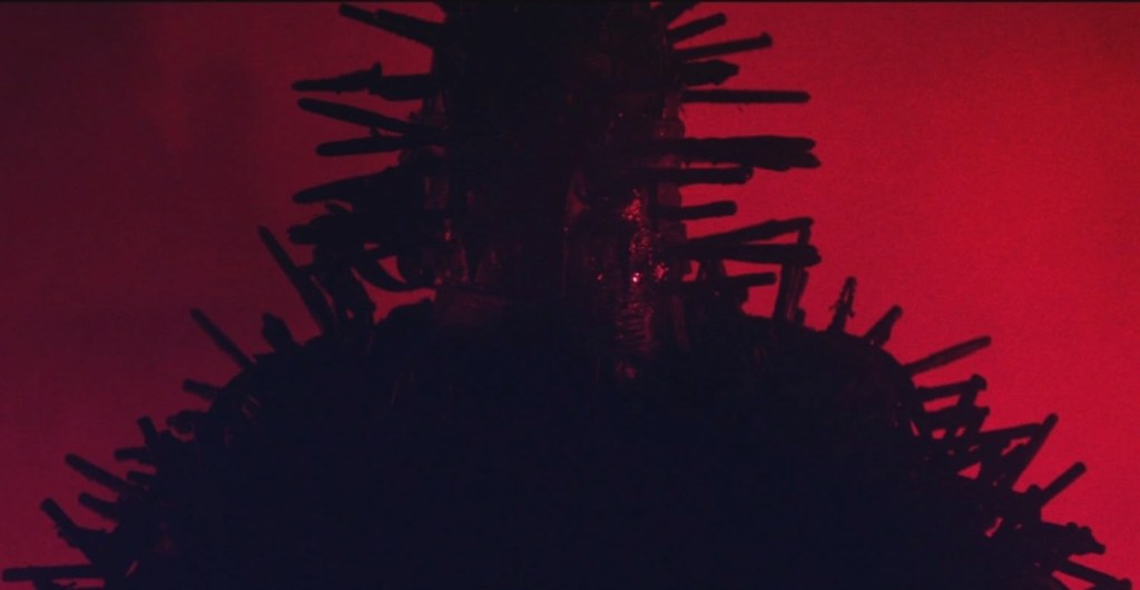When we finally get to see what’s become of Red, his mouth and arms are bound in barbed wire and he is hung from a metal structure outside of his home. Jeremiah introduces himself by stabbing Red deep with a dagger to the side. Harking back to a story Mandy told him in an earlier scene, about her own helplessness as a child witnessing the cruel murder of some hatchlings by her abusive father, Red must now face a similar but more extreme horror–the murder of his wife.