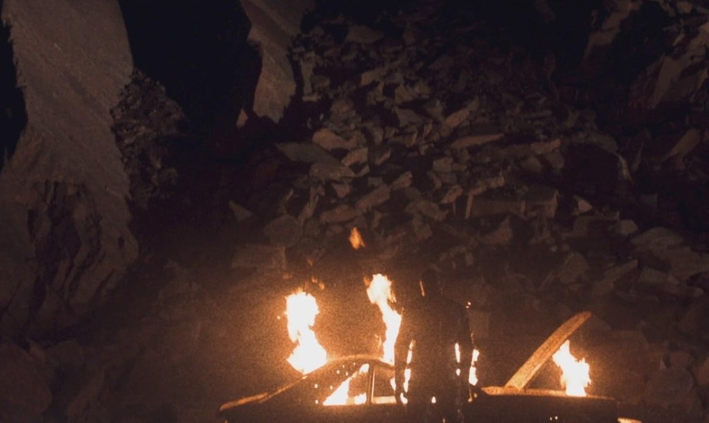 Inexplicably, the cultist creeps leave Red behind with the corpse, assuming (I guess) he’d die from either grief or the elements, and drive away as the ashes of Mandy smolder into the lawn. As the morning comes, Red tears free from his shackles (losing a lot of skin in the process) and cradles the skull and ashes of his immolated dead wife.