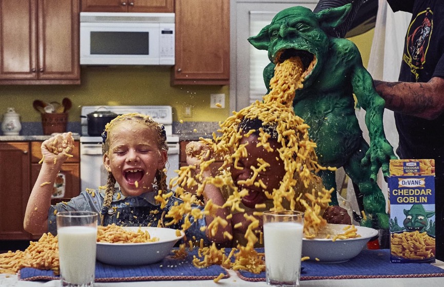 - After Red escapes from his barbed wire bondage he walks into his home and he sees a TV commercial for a macaroni and cheese brand (that looks like Kraft) but it’s called Cheese Goblins. The commercial features some freaky looking puppet goblins that vomit mac and cheese all over the laughing children in the commercial and then leer at the audience as the commercial ends. Why? Why not I guess.