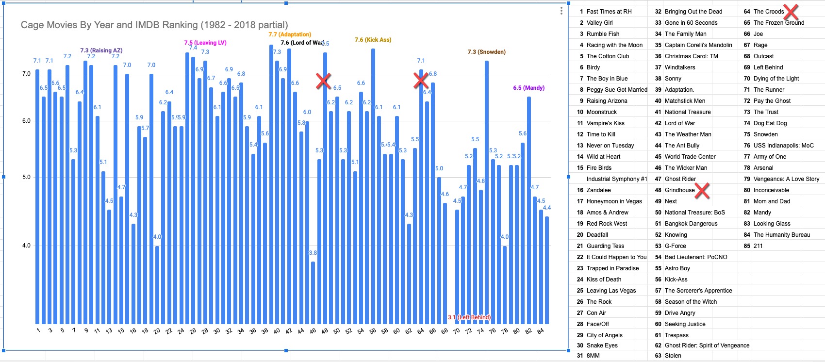 If you take this a step further and filter out Grindhouse, a Tarantino production that featured one line from Nicolas Cage, you only have Kick Ass and Lord of War scoring above 7 going all the way back to 2005.