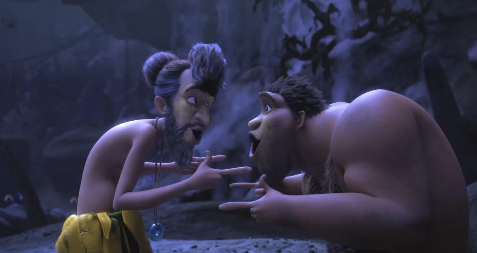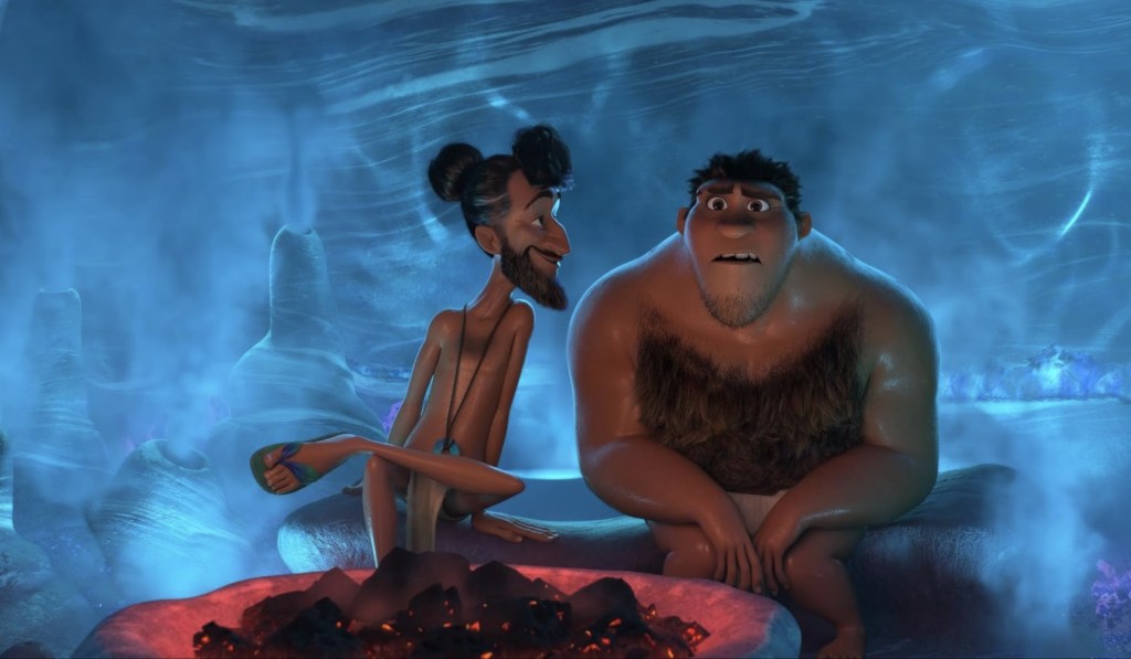 For example, when one of the characters says, they each will have separate rooms, one of the Croods replies, “What’s a separate.” The Bettermans drink their “bitter bean juice” in the mornings (i.e. coffee), and when Phil recommends that Grug remove his “fur pelt” in the sweat lodge for greater enjoyment, Grug says, “I already did.”