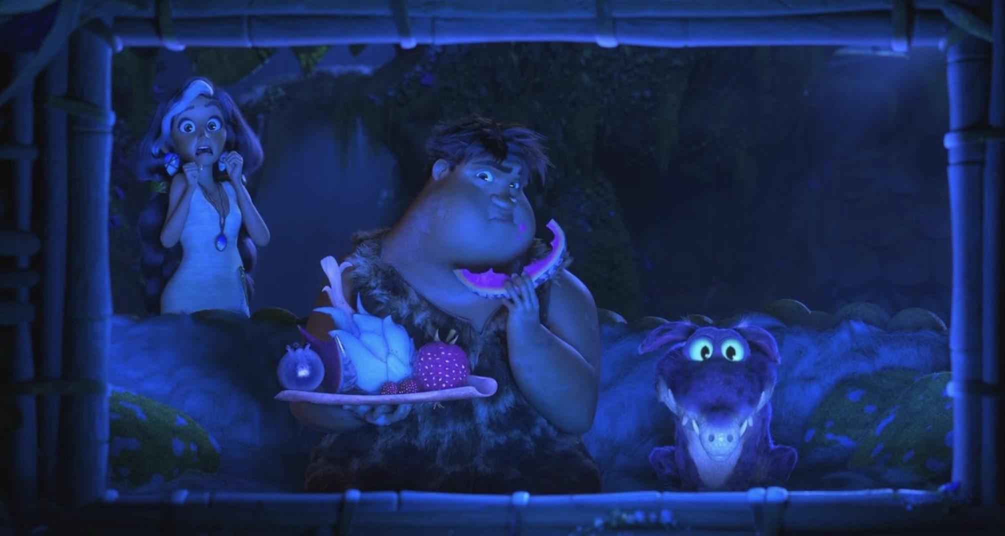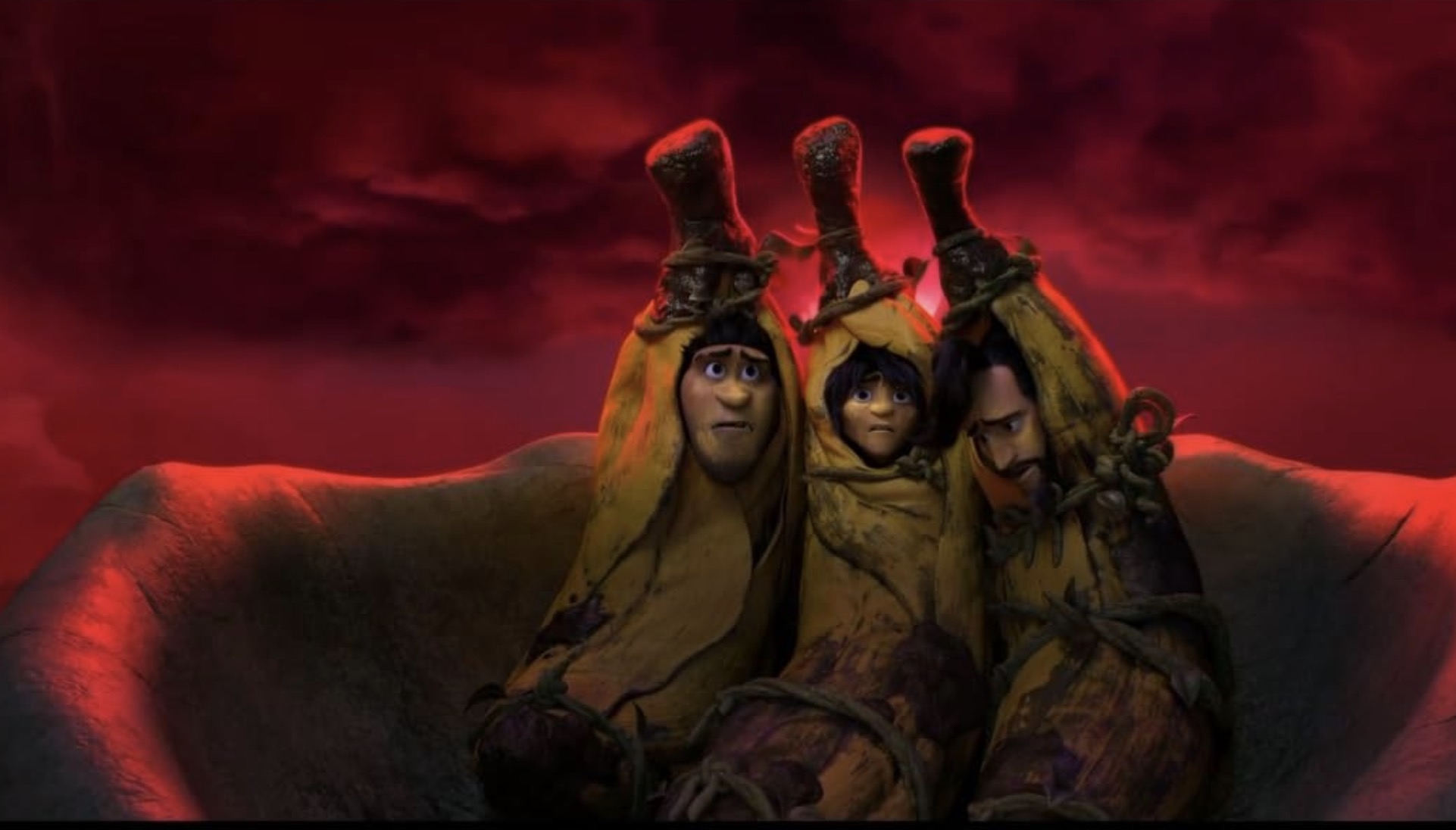 When tensions rise between the two-warring and value-crossed clans (think Meet the Fockers) and as the young couple begin to be broken apart the Croods rebel against their hosts rules. Grug eats all the bananas and this triggers an environmental and systemic collapse in the Betterman society.