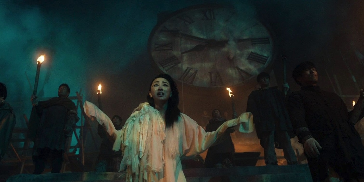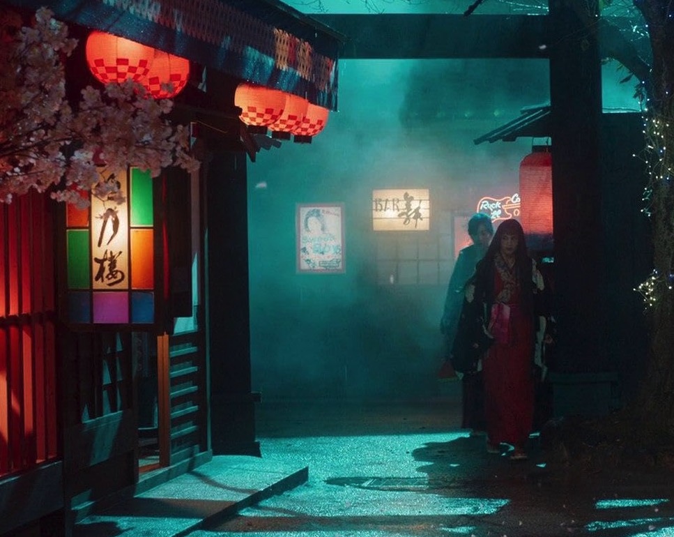 Flashing to another part of this same city, which feels like a Japanese amusement park depicting feudal Japan alongside a Universal Studios wild west movie lot, we see three women fleeing what could be a brothel or the concubine’s quarters from the Last Samurai.