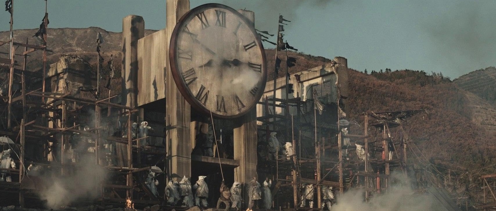 This is where the film gets pretty surreal. Kind of like the Mad Max films, this post-apocalyptic community out in the desert have created their own form of economy, community, and cultural norms. Everything is sustenance level, dirty, industrial, and broken. There are people who are dressed like mannequins, there are rat scavengers with metal exoskeleton suits that strip down cars and create metal structures with them, there are prophetic looking white guys who tell stories, there is a Chorus that sings strange histories while showing pictures of the holocaust, and there is an entire group of cavemen looking fellows who do nothing but have a tug of war with a giant clock all the day. The cavemen pull a rope that prevents the second / minute hand on the clock from moving forward. The tug-o-war crew shout that if they “don’t stop time” there will be another explosion again.