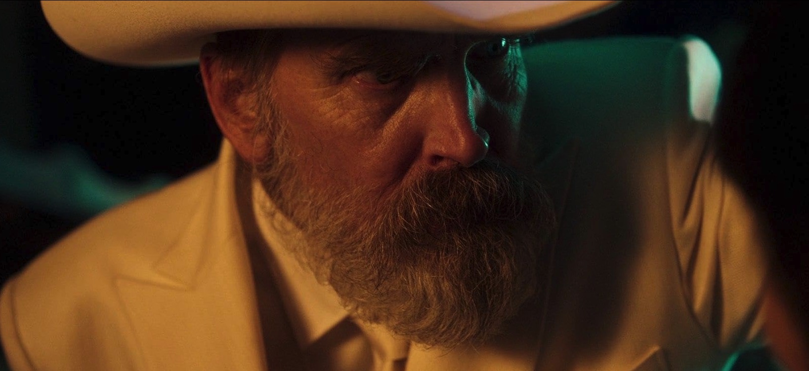 We soon learn that the strange Japanese / Wild West town is run by an old bearded cowboy called The Governor (Bill Moseley), who looks like a white-bearded Rick Rubin except he wears an all-white suit, a ten-gallon snow-white hat, and blood-red colored gloves.