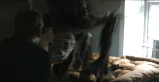 Meanwhile, one of the creatures has found a break in the stronghold where Joseph is sleeping. In a tense scene where the creature is testing the opening to home with his elongated claws, Joseph seems sure to be attacked and killed by the creature as he is sleeping in a rocking chair very close to the door. The creature finds a way to open the door and rushes in, but not before Joseph can spring a trap–a cage falls from the ceiling trapping the creature just as Joseph had hoped. He used himself as bait.